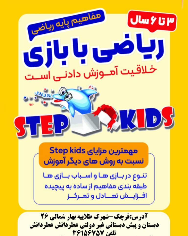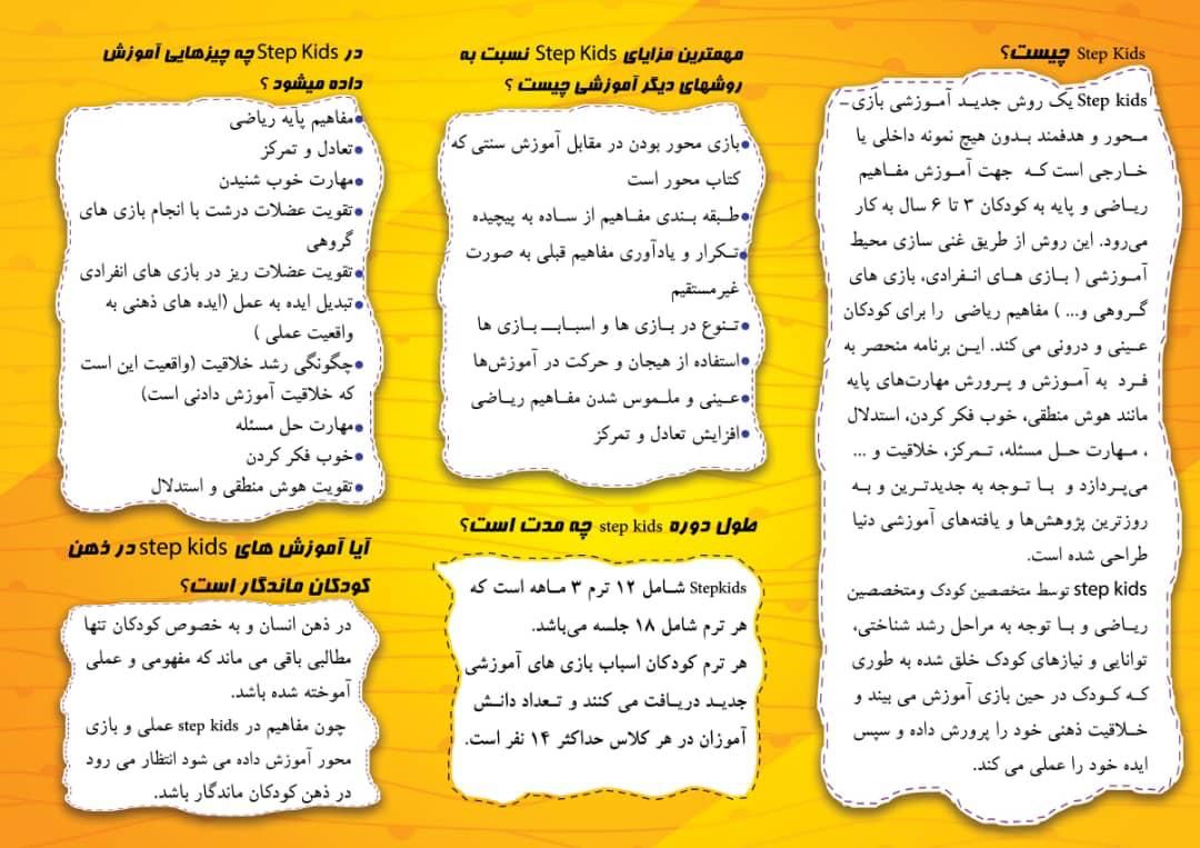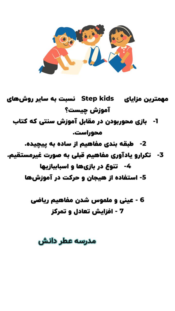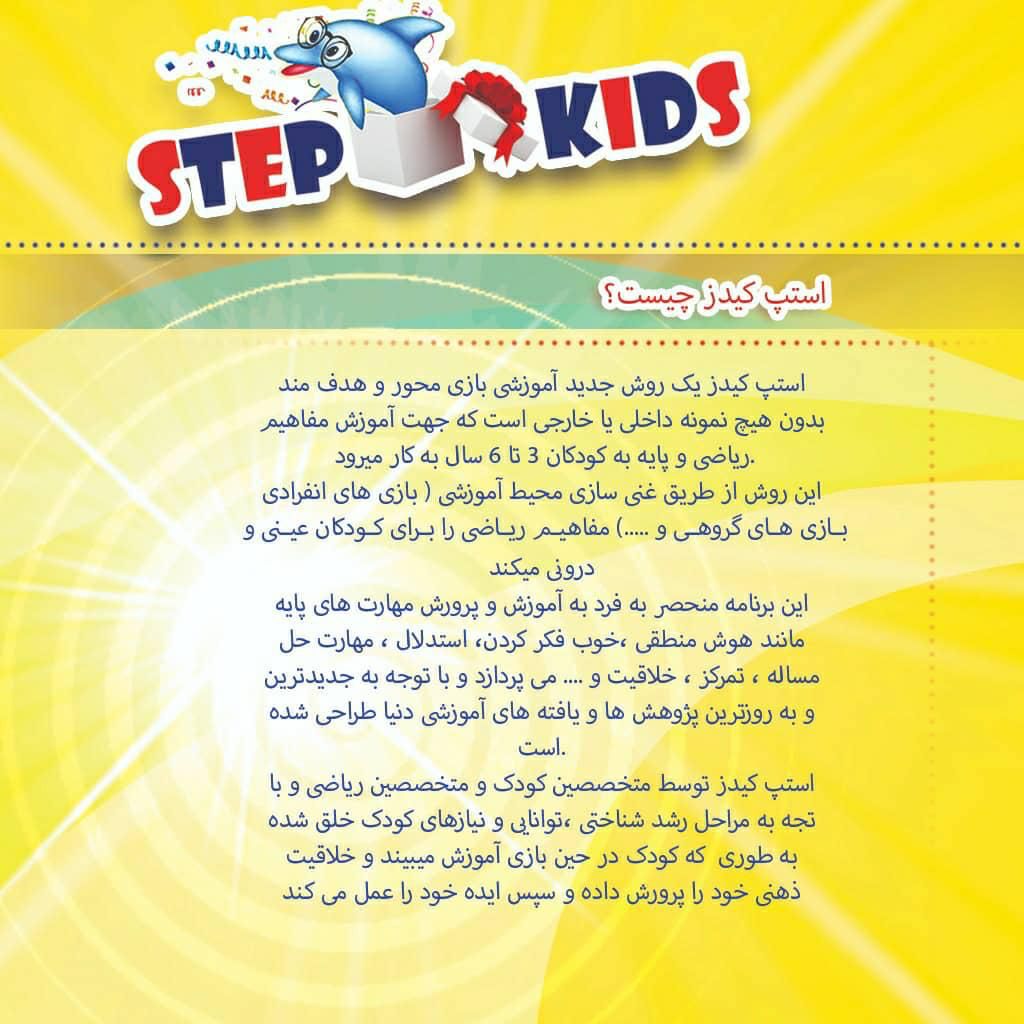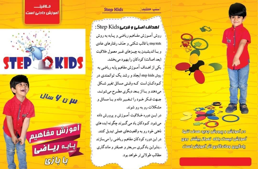 استپ کیدز یک روش جدید آموزشی بازی محور و هدفمند بدون هیچ نمونه داخلی یا خارجی است که جهت آموزش مفاهیم ریاضی و پایه به کودکان 3 تا 6 سال به کار میرود. این روش از طریق غنیسازی محیط آموزشی (بازیهای انفرادی، بازیهای گروهی و…) مفاهیم ریاضی را برای کودکان عینی و درونی میکند.